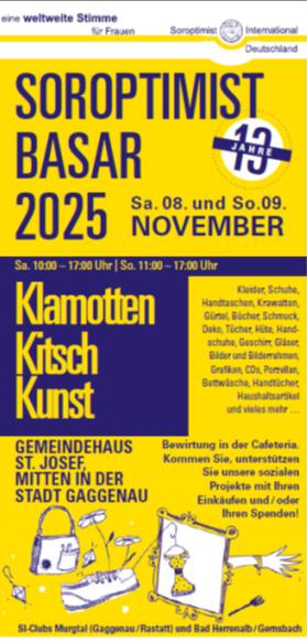 Wir freuen uns sehr, dass wir in diesemJahr den 13. SOROPTIMIST BASAR im Gemeindehaus St. Josef mitten in der Stadt am 08. und 09. November 2025 durchführenkönnen.